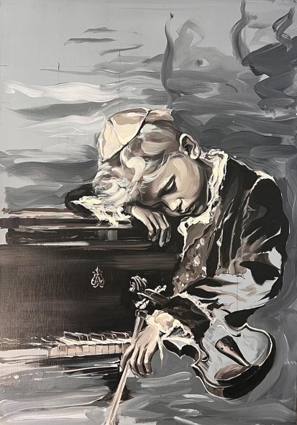 The tones the painting takes on and maintain a restrained monotony, concealing a storm beneath the surface. Sometimes, what seems soft is actually hard. What seems like love turns into hate. The proportions and composition are undefined, emphasizing the subjectivity inherent in the artist's unique perspective. There is a sense of primality captured here—a play on the idea and its opposite. A dance or a battle, brutality or softness, hard or soft, death or life . The unique code-based language of the works, deconstructs the narrative into its most basic, primal components. There is a recurring connection—sometimes overt, sometimes hidden—leading to the same story, regardless of the time from which we approach it. History takes on a new cycle each time.
