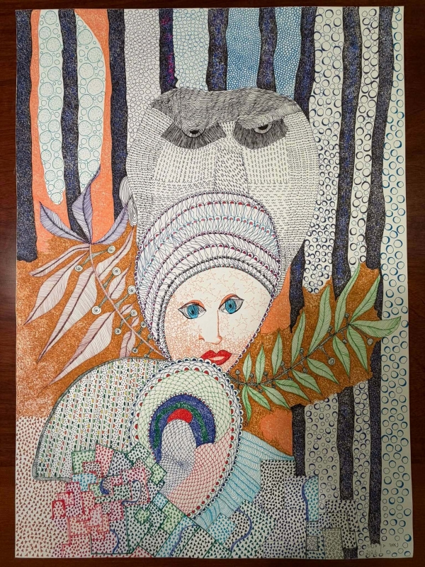 The texture of the black-and-white series begins with a scribble made during a telephone conversation, which is a psycho-motor movement that comes from the brain unconsciously. That is, it is automatism, characteristic of Surrealism, which flows from the subconscious without control, and as it progresses, it takes on forms and meanings, which she completes into the random visual appearance. (She moved to color following the recommendation of Yoram Rozov, who told her that she had exhausted black/white.)